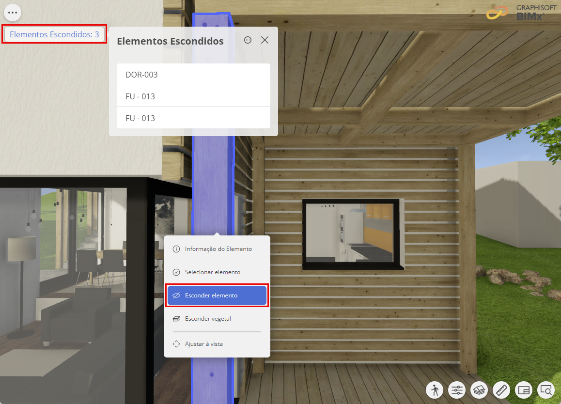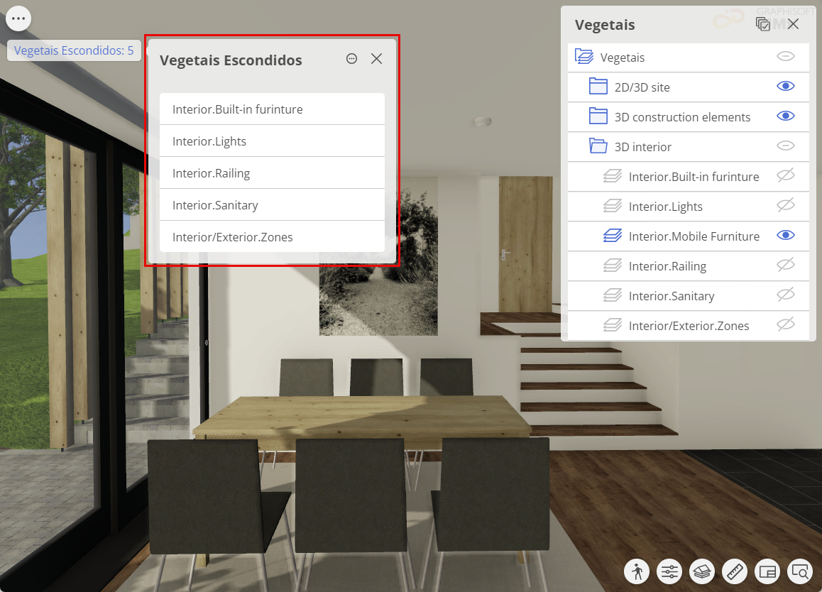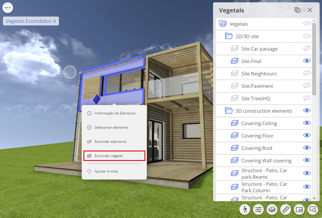 Para saber mais sobre o controle da visibilidade de elementos 3D e vegetais no BIMx, consulte Esconder elementos 3D e vegetais.