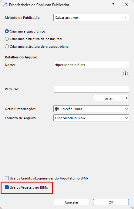 Ao contrário do Archicad, a seleção de outra combinação de Vegetais no BIMx não revelará elementos que não estejam incluídos no modelo 3D original. O conteúdo do Hiper-modelo BIMx deve ser definido antes da publicação.