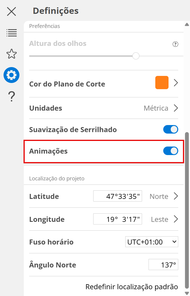 O BIMx usa automaticamente a localização real do projeto, com base nos seus dados de localização definidos no Archicad. Essas informações de localização são exibidas nas Definições do BIMx, mas você também pode editá-las, se necessário.