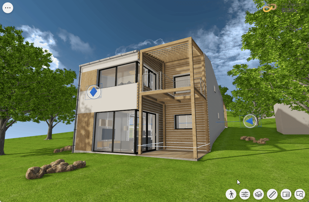 Dica: Ao clicar ou tocar duas vezes em um elemento colocará o edifício em vista frontal. Isso ajudará a criar vistas fáceis de elevação/corte na axonometria. Você pode combinar isso com um plano de corte, várias configurações de sol por hora e salvar suas vistas favoritas.