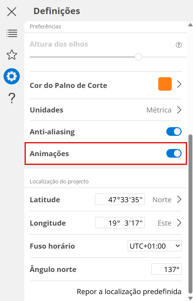 O BIMx utiliza automaticamente a localização real do projecto, com base nos seus dados de localização definidos no Archicad. Esta informação de localização é apresentada nas Definições BIMx, mas também a pode editar, se necessário.