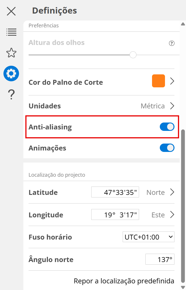 O efeito de anti-aliasing está activado por predefinição para garantir que as arestas são mais suaves nas vistas 3D do BIMx.