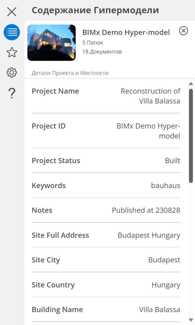Прим.: Информация о Гипермодели и изображение Предпросмотра Проекта генерируются на основе данных о проекте в Archicad или DDScad. Если соответствующие данные не были добавлены при экспорте Гипермодели, то кнопка Информации не отображается в BIMx.