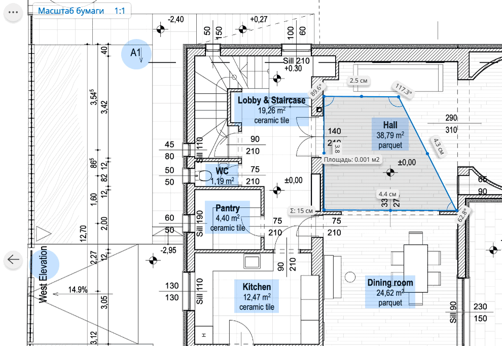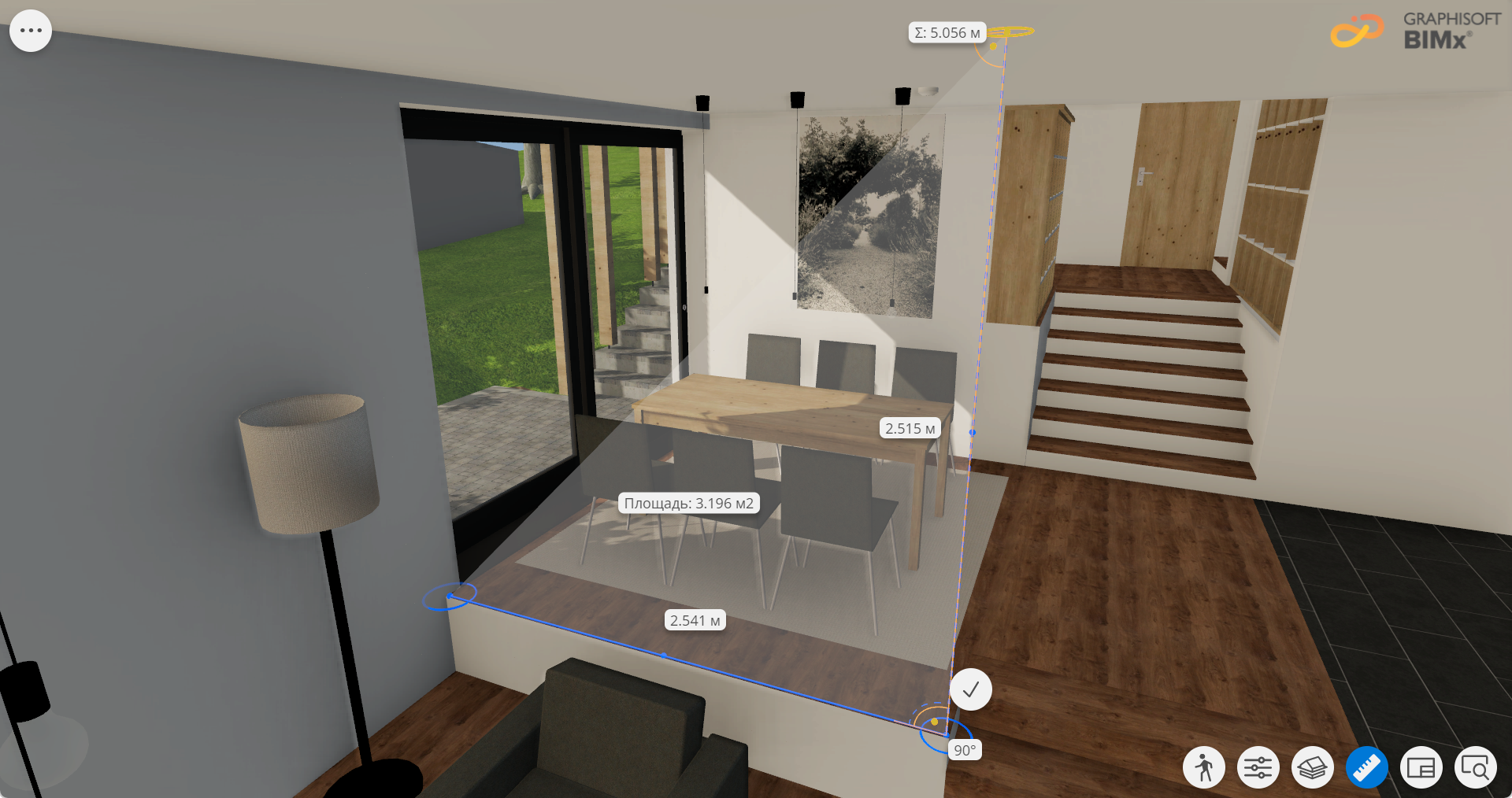 Откройте любой 3D-вид, присутствующий в Гипермодели BIMx. Инструмент Измерения в 3D работает практически так же, как и в 2D, но со следующими отличиями: