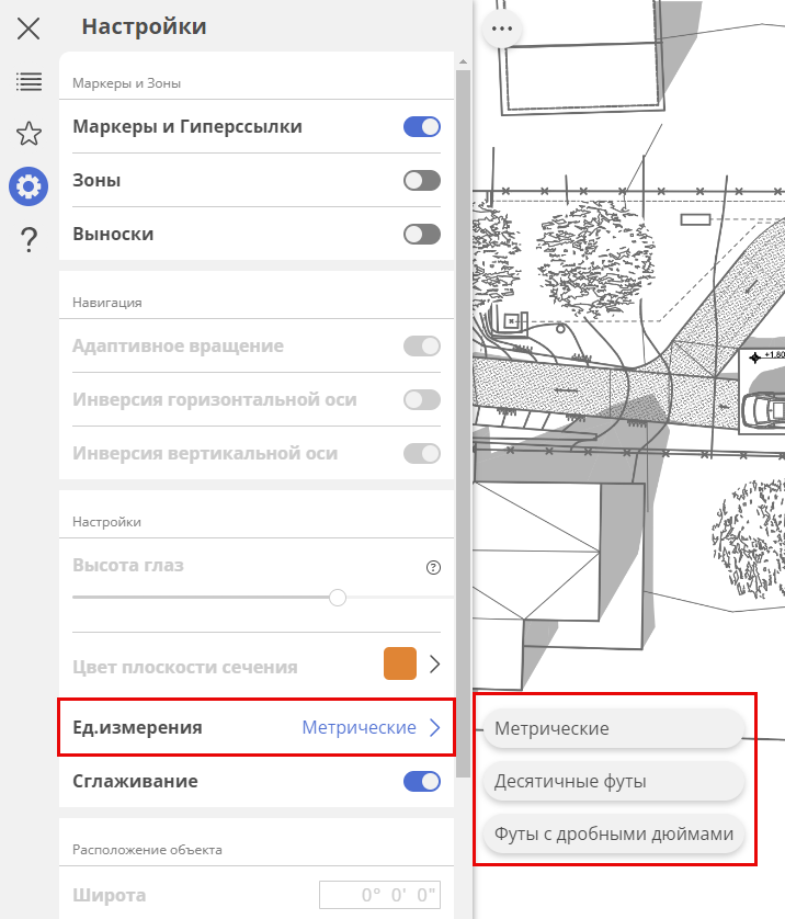 Вы можете настроить масштаб, нажав на метку в верхнем левом углу.