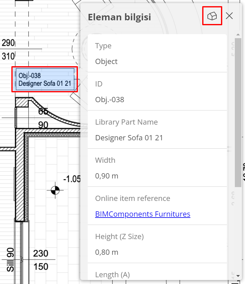 Paftadan BIM öğesi verilerine erişmek için bir etikete tıklayın