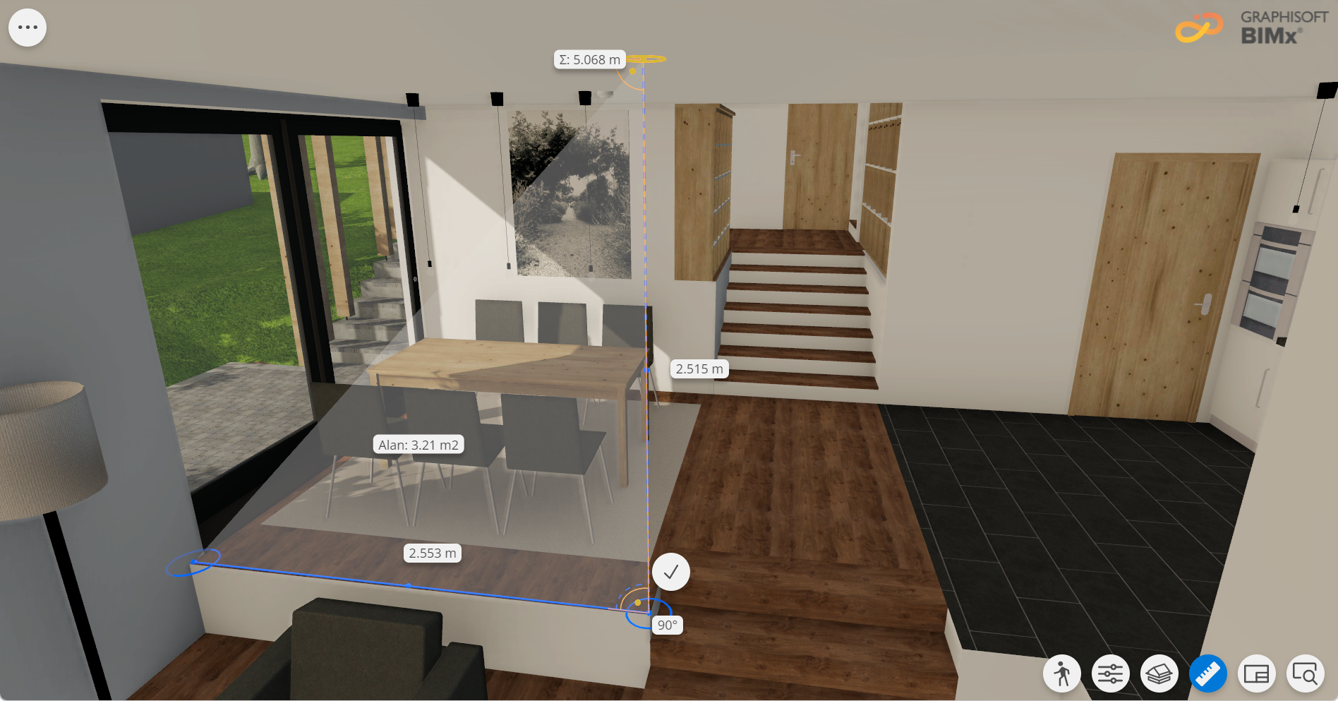 BIMx Hiper-modelinizde bulunan herhangi bir 3D modeli açın. Ölçü aracı 2D ile hemen hemen aynı şekilde çalışır, ancak aşağıdaki farklılıklar vardır:
