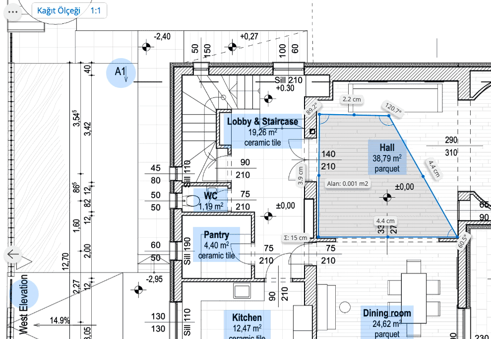 Sadece bir duvarın uzunluğunu veya kapalı bir alanı ölçmek isteyebilirsiniz. Araç, üç nokta yerleştirilir yerleştirilmez size bir alan verebilecektir. Verilen ölçüler: