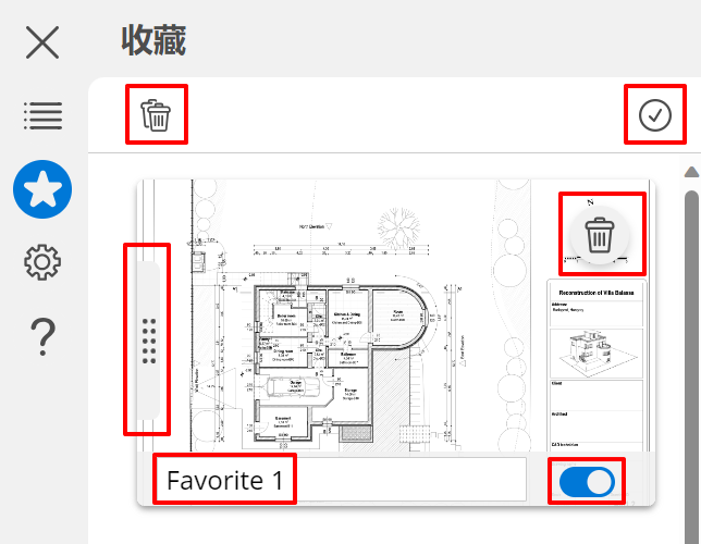 与作为超模型一部分的展板内容不同,收藏内容存储在您的计算机(BIMx 桌面端)或网络浏览器(BIMx 网页端)上。因此,如果您共享您的超级模型,是不包含收藏内容的。