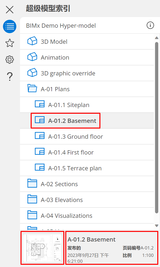 超级模型索引 列出超级模型中的所有视图和文件夹 单击打开任意文件夹查看其中的内容。 要打开任何项目,请双击它,或点击其预览图。 如果你没有看到索引:悬停在左上角的菜单上,从屏幕的左上角打开模型索引。单击进行分配。 查看选中项目的预览图从超模型索引中选择一个三维模型或二维文档。 查看位于底部的预览图,并添加基本信息: 点击预览来打开该项。
