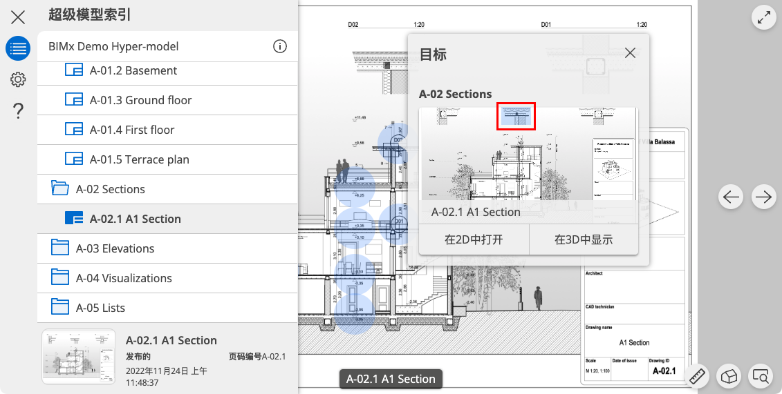 使用标记打开布图 点击任何二维或三维标记,打开目标对话框,看到相应视图的名称和预览。 在目标对话框中,单击在2D中打开 或 在3D中显示以跳转至所需的视图。(或单击布图预览)。 图 1. 目标布图预览中高亮显示出详图视图 如果布图 包含多个视图,相关的视图(如平面图或剖面图)会以蓝色矩形标出。 三维的标记形状可能会有所不同,这取决于它所链接的视图,以及相机位是在建筑物内部还是外部。 当你在视图中移动时,标记会重新生成,所以你可以很容易地找到它们。 父主题: 使用标记进行浏览