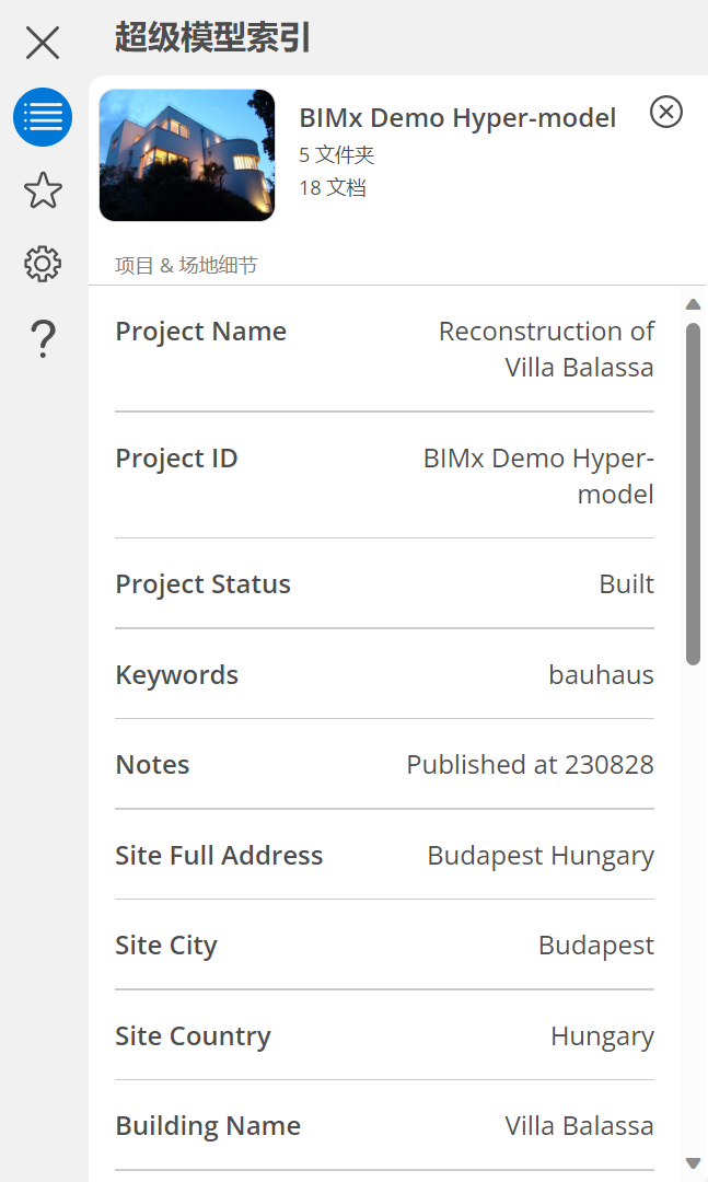 注: 超级模型信息和项目预览图片是根据 Archicad 或 DDScad 项目中的数据生成的。如果在导出的超模型中没有添加这样的数据,你就不会在BIMx中看到信息按钮。