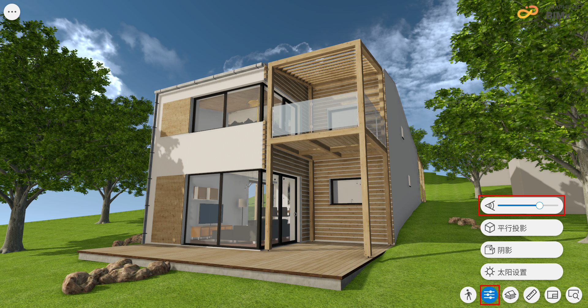 BIMx 中的默认投影方式取决于 Archicad 中定义的 3D 视图设置。以前导出的轴测三维模型将自动以平行投影方式打开。在平行投影中,重力、隐藏光标、操纵杆和摄像机视锥设置被禁用。