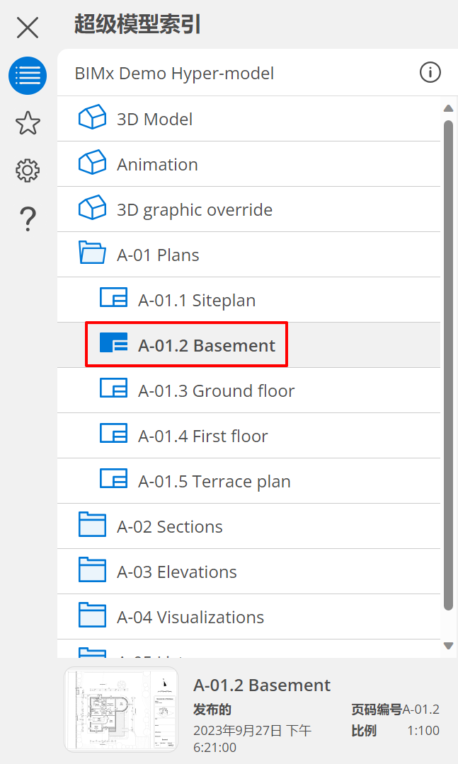 開啟三維模型或二維文檔 要開始瀏覽,請開啟超模型視圖 在索引中,執行下列任一操作: 雙擊任何項或檔案夾 點擊某個項並在下方瀏覽其訊息,再在預覽按鈕上點擊“點擊以查看”執行開啟操作。 對於當前開啟的內容,圖標是彩色的。 切換 3D 模型 以當前設定切換到另一個 3D 模型 撤銷/重做
