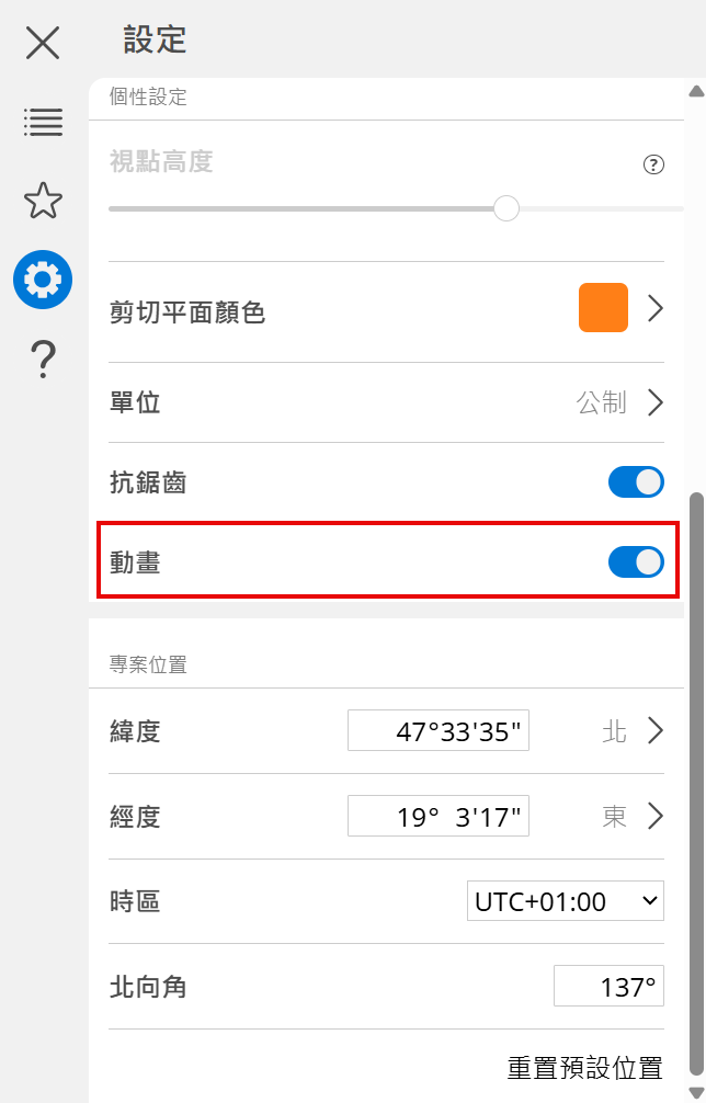 根據您在 Archicad 中設定的位置數據,BIMx 會自動使用真實的專案位置。該位置訊息顯示在 BIMx 設定中,但您也可以根據需要進行編輯。