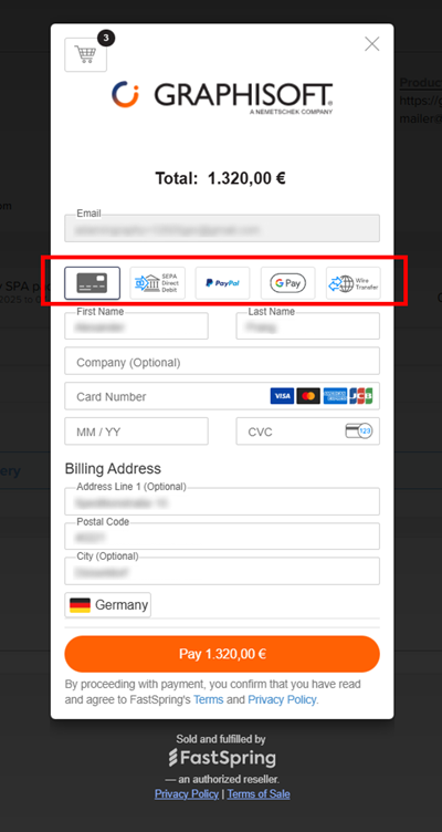 Sie können Ihre Rechnungsdaten direkt auf der Rechnung bearbeiten, bevor Sie auf „Jetzt bezahlen“ klicken. Die Quittung, die Ihnen FastSpring nach Zahlungseingang ausstellt, zeigt Ihre aktualisierten Rechnungsdaten an.