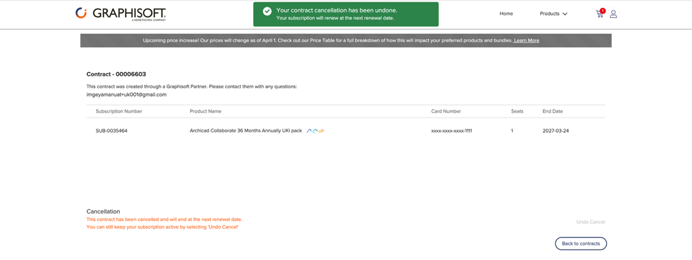 Sì, è possibile ripristinare un contratto annullato utilizzando l'opzione Annulla cancellazione. È disponibile solo per i contratti non ancora scaduti. Una volta ripristinato, il contratto riprenderà e si rinnoverà alla data di scadenza originale.