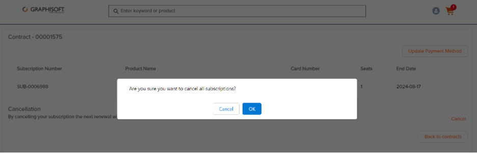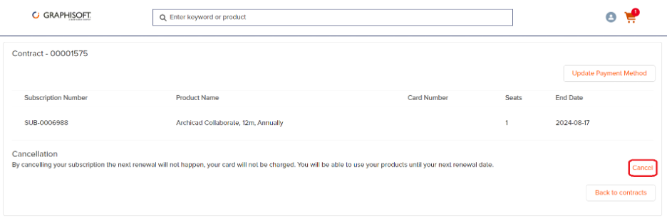 元のお客様および契約管理者は、サブスクリプション更新日(中央ヨーロッパ時間 (CET))の48時間前までにサブスクリプションをキャンセルすることができます。Graphisoft Storeのサブスクリプションのキャンセル機能をご利用ください。キャンセルは、現在のサブスクリプション期間の終了時に有効となります。