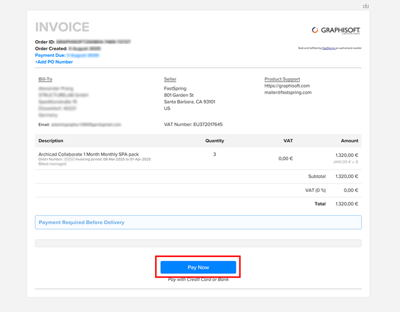 今すぐ支払うをクリックする前に、請求書上で請求情報を直接編集することができます。お支払いの受領後にFastSpringから発行される領収書には、最新の請求情報が表示されます。