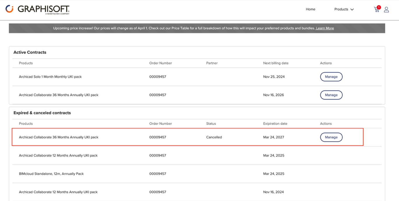 - 期限切れおよびキャンセルされた契約の下にリストされている契約を確認します。再開したい契約の 管理する ボタンをクリックします。